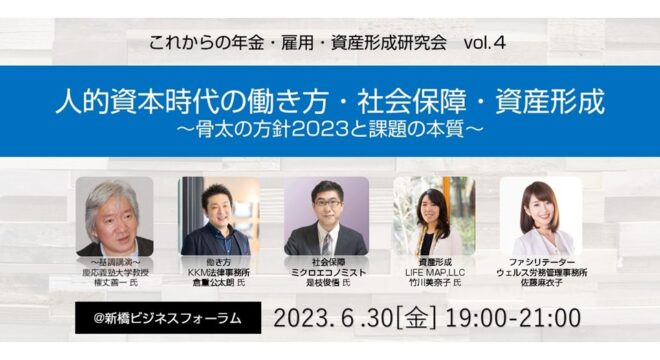 コロナ禍を経て、働き方・社会保障・資産形成をとりまく環境は大きな転換期を迎えています。人への投資、賃上げ、日本版ジョブ型、年金改正、社会保険の壁、資産所得倍増計画、新しいNISA …などの気になるトピックについて、各専門家の皆さまの意見をきいて議論をしたく、第4回セミナーの開催に至りました。