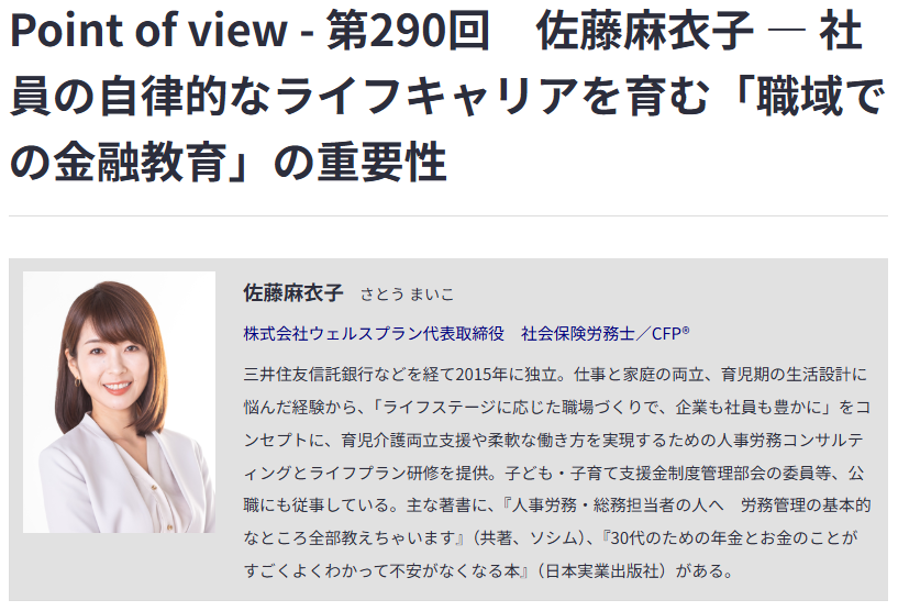 ☆リンク→Point of view – 第290回 佐藤麻衣子 ― 社員の自律的なライフキャリアを育む「職域での金融教育」の重要性